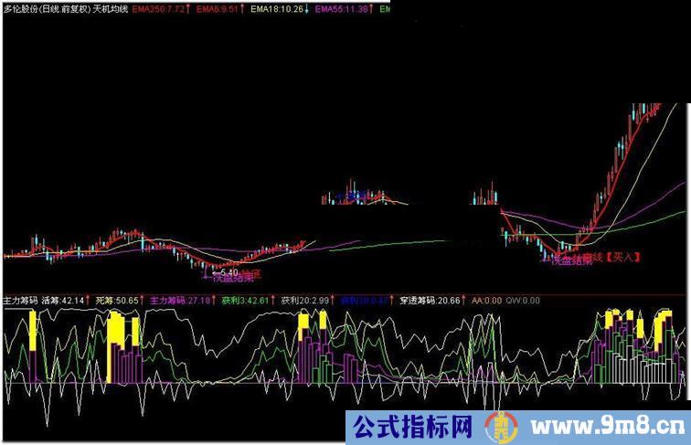 用法:以紫红色活筹为核心,当你在使用[主力建仓]发现股价在60日均线和建仓线上时以错过了股价的最佳买入时机,你可以立刻用现在的这个指标里的活筹来研判!当活筹出现时你可以考虑跟庄{因为活筹是庄家拉升的信号,当然这个指标里也有庄家筹码,要是庄家筹码出现{白色柱体]那可就是牛了!95%100是大牛股了