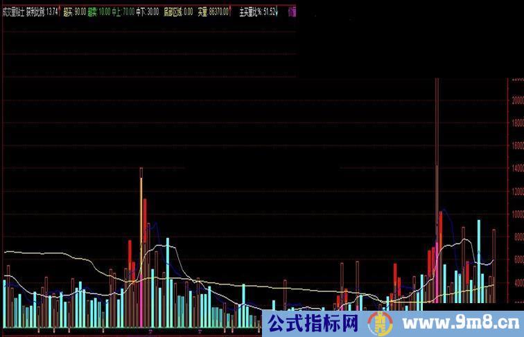 DRAWTEXT(REF(获利比例,1)>90 AND 获利比例<90,获利比例,'卖'),COLORCYAN;底部区域:MA(IF(L<=LLV(L,15),MA(C,20),0),3)/200,VOLSTICK;