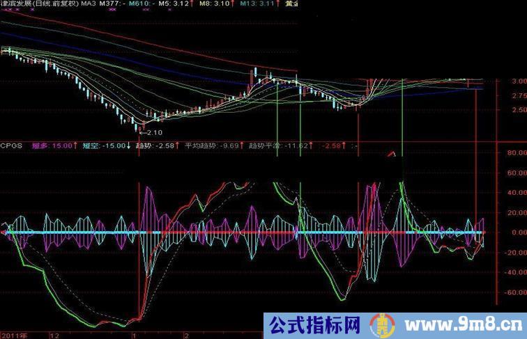或短空绿线下穿"强弱分界"线时卖出。特别是在股价有了相当涨幅后趋势线与平均趋势线下穿上升的短空绿线时,必须清仓。