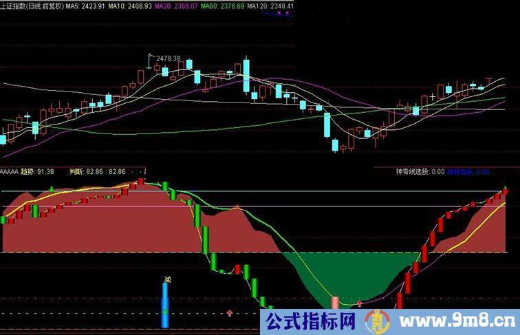 IF(判断>50 AND 趋势<判断,判断,DRAWNULL),COLORGREEN,LINETHICK2;