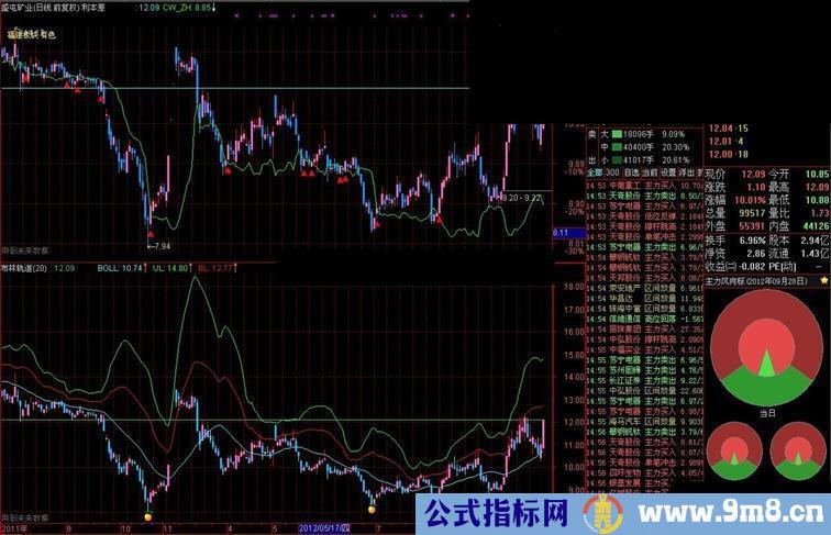 说明:本指标注重的是买点。股价沿着中轨上升系强势涨升,一旦接近上轨注意及时止盈。中轨与上轨几乎并线则预示股价涨势过快,头部不远。随时注意止盈。大部分情况下股价上穿下轨系比较好的买点。上穿中轨则进入拉升阶段。沿着中轨持续上涨的个股一般都有比较好的涨幅。使用中注意观察
