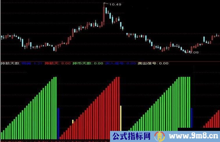 买入信号:IF(REF(持币天数,1)>0 AND 持币天数=0,3,0),STICK,COLORBLUE;