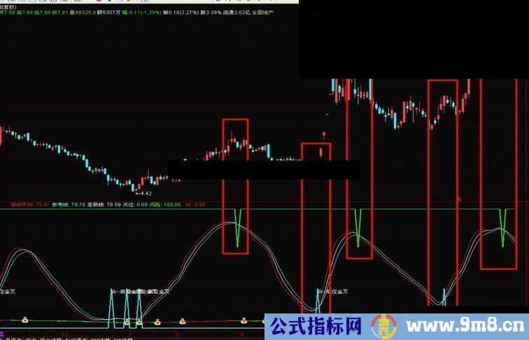 风险: IF(CROSS(参考线,移动平均) AND 参考线>75,68,100) , COLORGREEN,LINETHICK2;