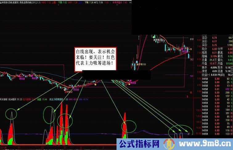 使用说明,白线出现,买入机会!截图中有提示,红色表示主力进场吸筹!非原创,仅为分享交流!坛友们可自己多找些个股研究一下此指标,对比一下!