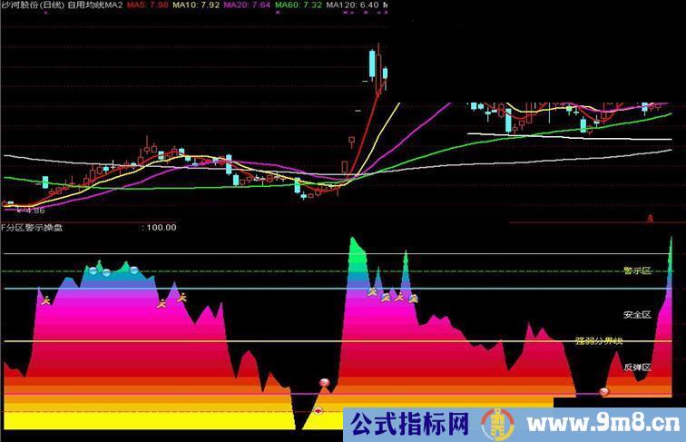 献给小散们端午节的小礼品——分区警示操盘副图指标,该指标参考了《寻庄问股》老师的(空军作战》指标的有关资料,重新编辑而美化而成的,图中分别指示了操盘的4个区域及买卖标识,相信小散们能看懂。过节了,大家玩玩,只图的快活