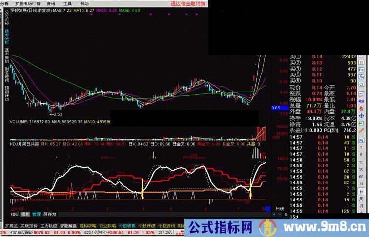 月K:"KDJ.K#MONTH"(9,3,3),COLOR0080FF,DOTLINE;