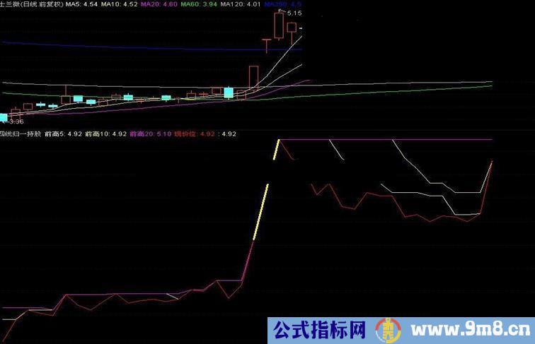 IF(现价位=前高10,现价位,DRAWNULL),LINETHICK3,COLORYELLOW;