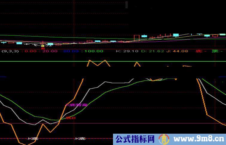 DRAWTEXT(KDJ底背离,REF(J1,A1+2),'.K底'),COLORWHITE;