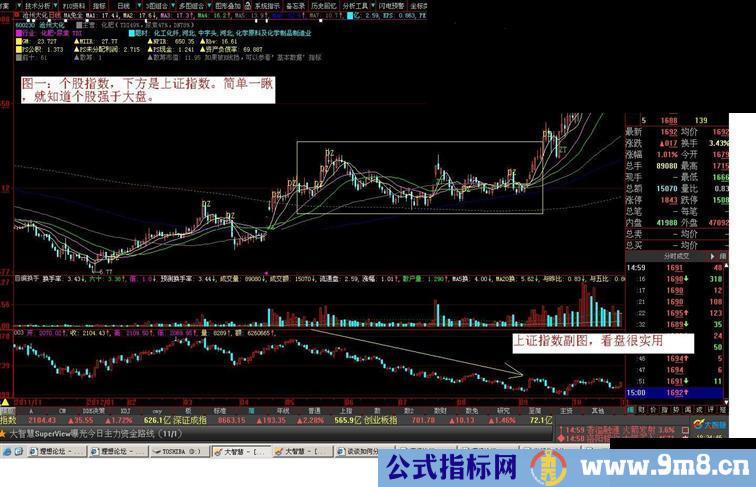 3、大智慧的上证指数图比较全面。通达信要做全面,我还需要寻找相应的函数。因为我编公式平台主要是以大智慧为主。对通达信的熟悉度有限,暂时也不想去研究通达信的公式系统。所以不好意思,简单了些。