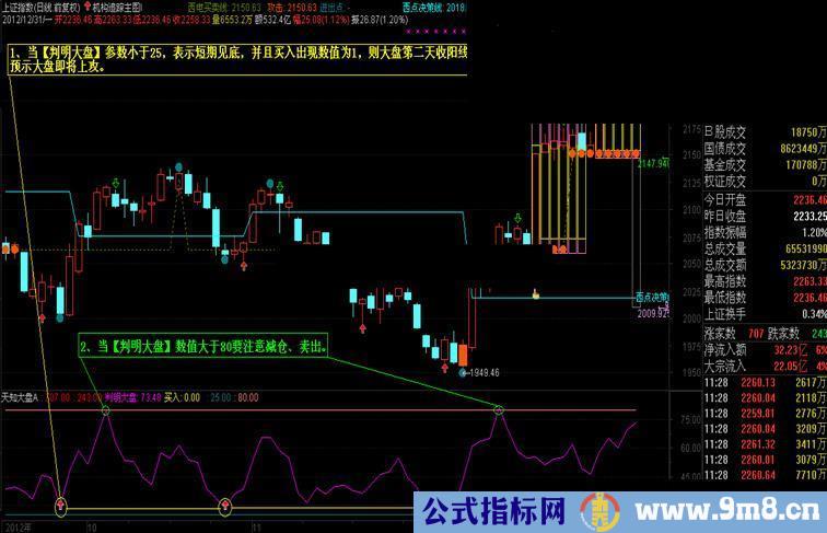 1、当【判明大盘】参数小于25,表示短期见底,并且买入出现数值为1,则大盘第二天收阳线的概率几乎100%,预示大盘即将上攻。
