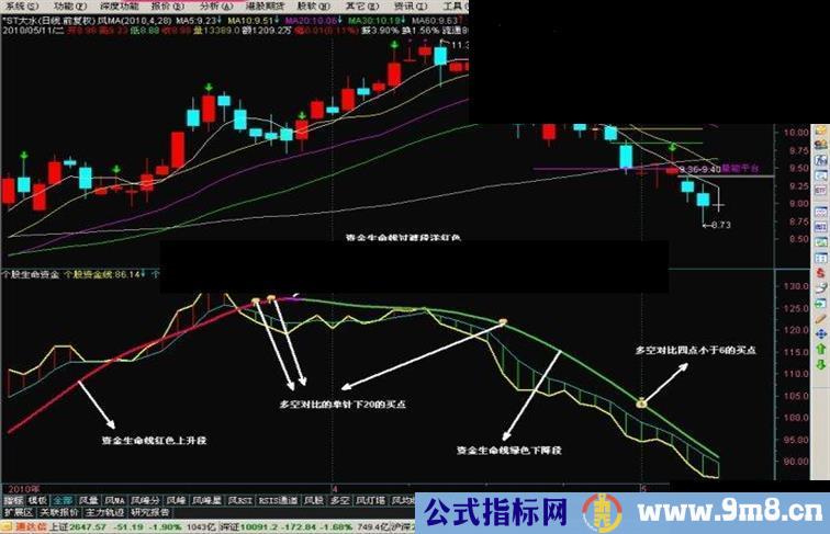 IF(资金生命线<=REF(资金生命线,1),资金生命线,DRAWNULL),COLORGREEN,LINETHICK2;