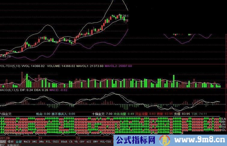 用法:大家可以看到,指标是由六行箭头组成,六行箭头分别代表了上述接介绍的六大指标,红色箭头代表了当时此指标出现金叉,而六大指标同时金叉时,箭头全部为红色,这将是一个很壮观的介入机会,如果有的指标红色有的绿色怎么办呢(即六大指标中有的金叉有的死叉),只是我们遵循少数服从多数的原则,有4个箭头向上即发出买入信号,行情形成。相反卖出的时候也是这样。