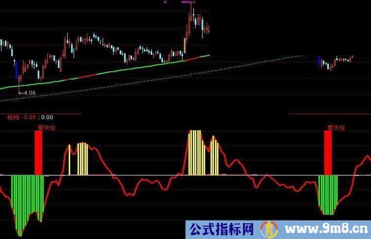 主力线下方出现绿柱表示有大资金进入,出现绿柱的同时主力线上方出现红柱及“擎天柱”字样表示可以介入;主力线上方出现黄柱表示准备冲顶,应当择机获利了结,规避风险。