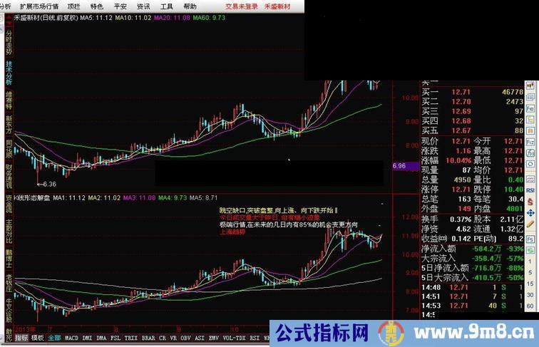 DRAWTEXT(T22=1 AND CURRBARSCOUNT=58,AAA-(AAA*TS22),'多方炮,底部可能上涨,中间上涨中继,顶部见顶信号‖'),COLOR00FFFF ;