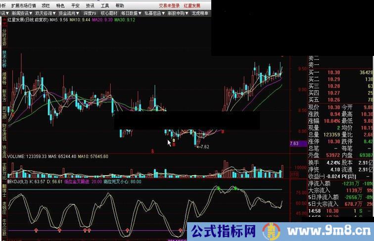 N 2 100 9 M 2 100 3 LOWV:=LLV(LOW,N); HIGHV:=HHV(HIGH,N); RSV:=EMA((CLOSE-LOWV)/(HIGHV-LOWV)*100,M); K:EMA(RSV,M); D:MA(K,M); 低位金叉跟进:20; 高位死叉小心:80,COLORFFFF00; 条件:=CROSS(K,D) AND K<40; 条件0:=CROSS(D,K) AND K>75; DRAWICON(条件,20,1); DRAWICON(条件0,80,2);