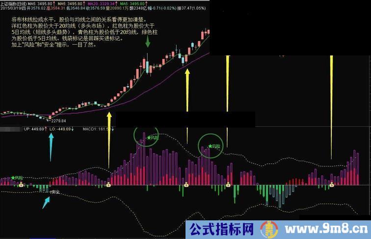将布林线拉成水平方向,看的更加清楚,加上股价与布林中轨(20日均线)和5日均线之间的关系柱状线,股价运行状态一目了然。增加“安全”、“风险”和钱袋子标志(回踩布林中轨买进提示),具体效果自己去好好体验,收获一定不小。