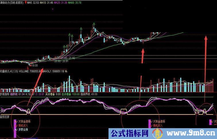 买点准备:IF(趋势线<=10,30,0),LINETHICK2,COLORYELLOW;
