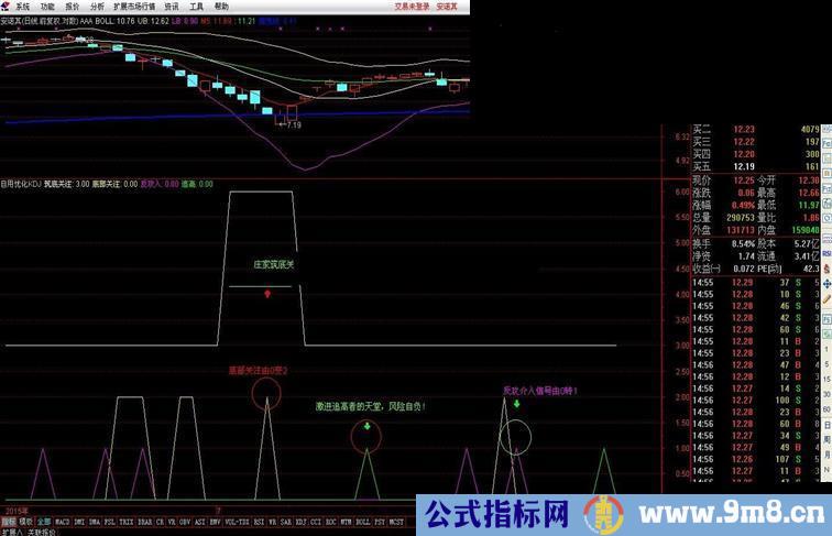 当然,没有十全十美的指标,单一指标的缺陷有时侯很明显,关键是要把握其中买卖趋势点,什么是金叉,什么是死叉,当然在底部是如何操作也是一个关键,这对于很多刚接触指标的人像是火星语,呵呵,这里说笑了。废话就不多说了,现分享个人优化的KDJ指标,希望对有缘人有一些参考帮助!如何操作,请看贴图!发表的公式不含未来函数,不加密,至于选股预警这里就不发表,下载源码后高手可以自行修改再优化,个人比较懒,能力有限,希望论坛的高手们为大众能制作更好选股预警,造福大家!