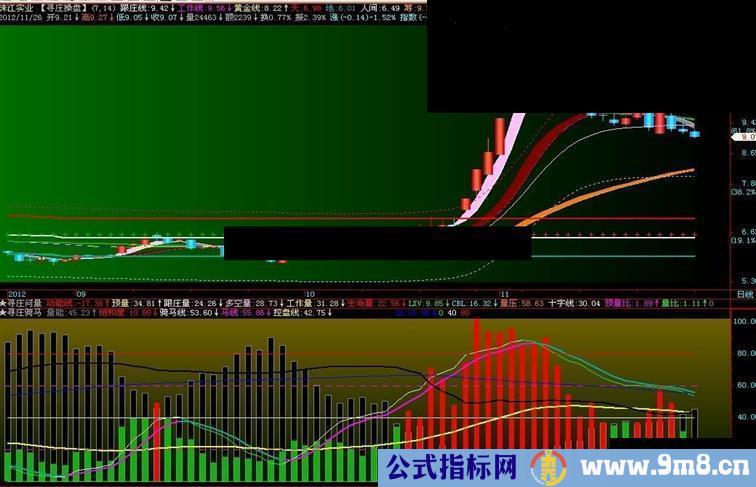 放出寻庄骑马指标后有的感到加一个配合指标更好一些,为此,在原指标的基础上再加黑马线与马线对应使用。用法说明,主要是要观察马线与黑马线的共振,就是马线要上去,黑马线要下来。图中的黑色线为黑马线,如果有的感到颜色不好可自行改变,如果有的感到线条太多可以另外作为一个指标