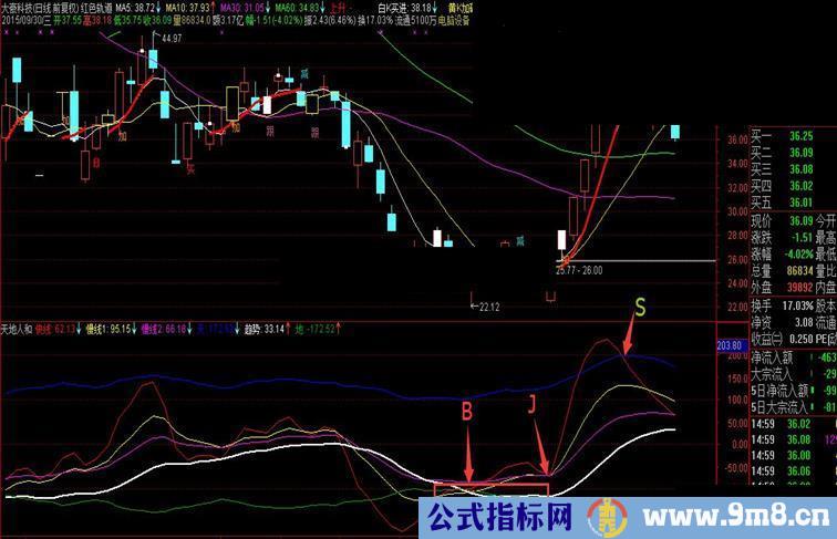 B点 即是快线上传趋势线和慢线1,J点是加仓点,快线没有击穿趋势线立刻就拐头向上,S点是卖出点,快线向下击穿“天”,清仓出局;