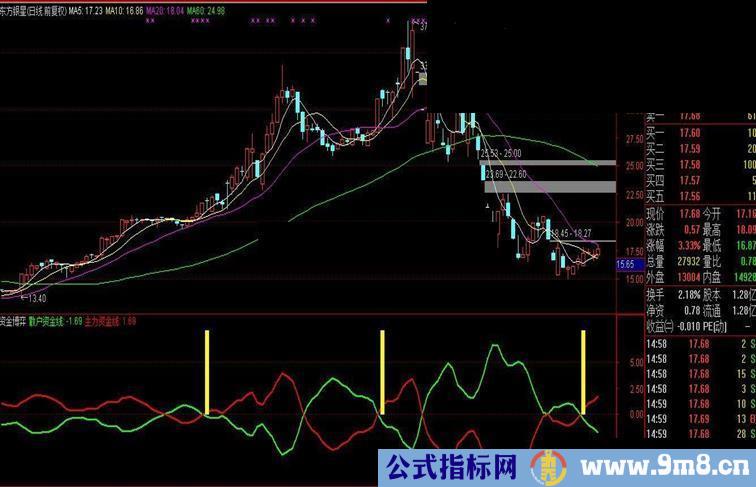 3.黄色柱子为主力资金上穿散户资金线的位置,附带黄柱选股。