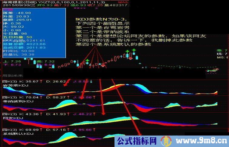 此指标原名三K,刚才在论坛上看到一网友的KDJ参数适合做波段,所以也加在里面了,如果该网友有意见,请告诉我,我立马删掉一组。KDJ的使用就不用说明了吧。我只是偷懒,把不同参数的KDJ放一个指标里,这样方便记忆,只要调节一下就不用换名称了。这贴只能叫分享思路,不是原创,是把他人的指标组合一下。
