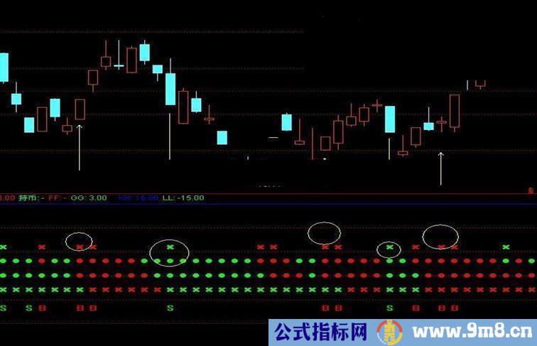 卖:IF(主力<0 AND 0<=REF(主力,1),6,DRAWNULL),CROSSDOT,LINETHICK3,COLORGREEN;