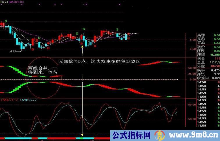 两根线,上穿买下穿卖,主图如果有B点提示买,但副图两根线是死状态,不买;同样,主图有S点提示卖但副图两根线是金叉状态,不卖,但如果此时有绿横条出来了,说明主力震仓,风险将至,为使利润最大化,随时准备离场观望。
