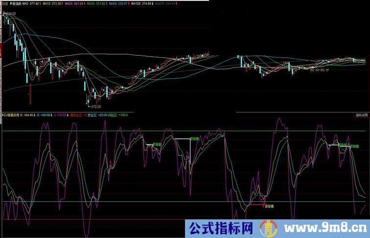 KDJ背离提示显示的指标 和同花顺原版的一样 只是原版的在指标中是上下绿线和蓝线之间 这个会过了绿线和蓝线走一点 要是按照原版的算钝化就是在刚过绿线和蓝线开始算。一样用 顶背离和底背离叉上后显示