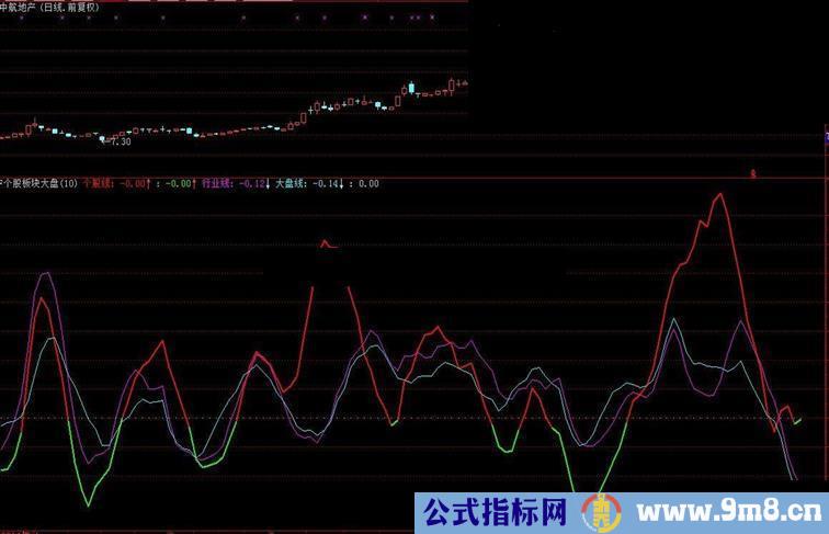 大盘线:=SLOPE(INDEXC,N)/MA(INDEXC,N)*10,COLORCYAN,LINETHICK1;