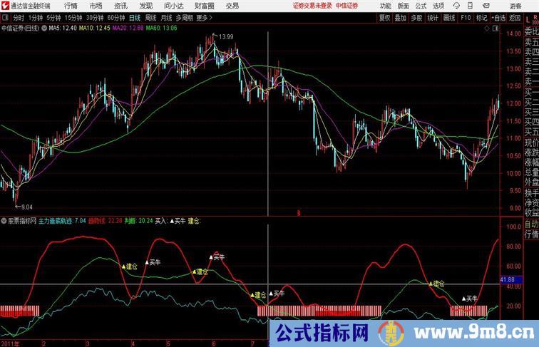 买入:DRAWTEXT(CROSS(趋势线,判断),趋势线+10,'▲买牛'),LINETHICK2,COLORWHITE;