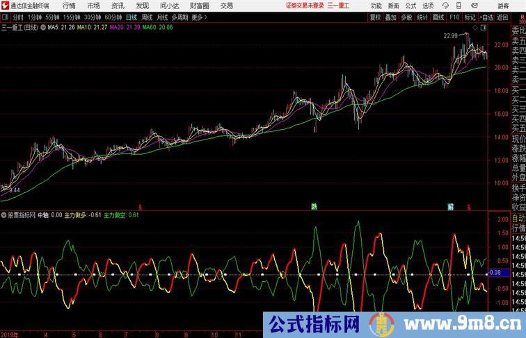 VAR1:=(CLOSE*2+HIGH+LOW)/4; VAR2:=EMA(VAR1,13)-EMA(VAR1,34); VAR3:=EMA(VAR2,5); 中轴:0,COLORWHITE,POINTDOT; 主力做多:2*(VAR2-VAR3)*3.8,LINETHICK2,COLORYELLOW; IF(主力做多>=REF(主力做多,1),主力做多,DRAWNULL),COLORRED,LINETHICK3; 主力做空:(-2)*(VAR2-VAR3)*3.8,LINETHICK1,COLORGREEN;