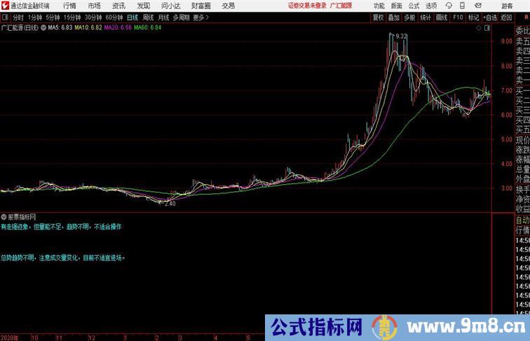 DRAWTEXT_FIX(情况14=1,0,0.00,0,'该股趋势不明,股价偏弱,注意量能变化,目前不宜参与。'),COLORCYAN;