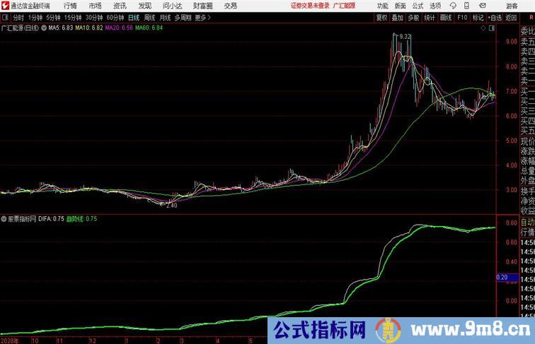 DIFD:=MACD.DIF#DAY; DIFW:=MACD.DIF#WEEK; DIFM:=MACD.DIF#MONTH; DIFA:EMA((DIFD+7*DIFW+31*DIFM)/39,5); 趋势线:EMA(DIFA,10)COLORGREEN LINETHICK2;