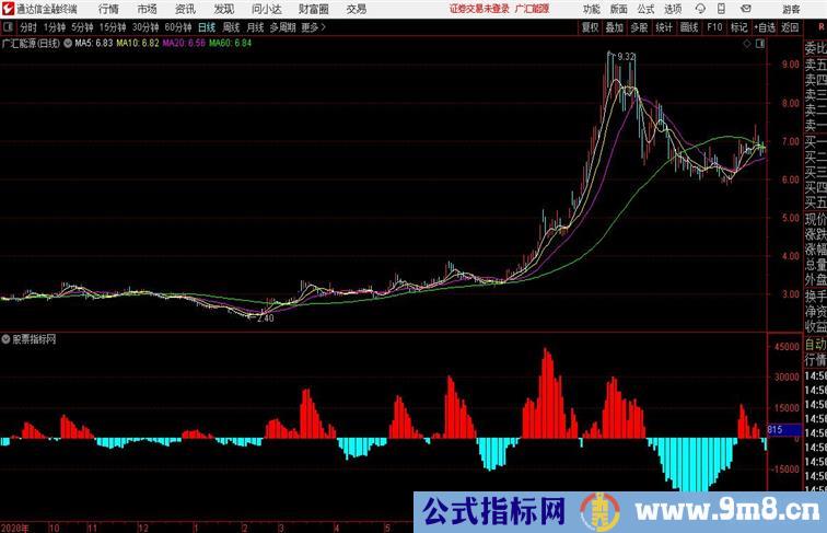 VAR2:=VOL; 能量:=V-MA(V,20); KJ:=MA(能量,21); K:=SMA(能量,21,1); D:=SMA(K,7,1); J:=3*K-2*D; MACD:=J*0.5,COLORSTICK; STICKLINE(MACD>=0,0,MACD,2.5,0),COLORRED; STICKLINE(MACD<0,0,MACD,2.5,0),COLORFFFF00;