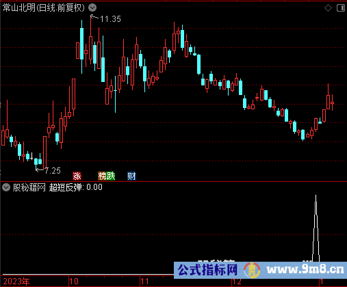 个股:=EMA(100*(C-LLV(LOW,34))/(HHV(H,34)-LLV(LOW,34)),3),COLOR1010FF;超短反弹:CROSS(个股,9);九毛八公式解读 个股赋值:100*(收盘价-34日内最低价的最低值)/(34日内最高价的最高值-34日内最低价的最低值)的3日指数移动平均,COLOR1010FF 输出超短反弹:个股上穿9