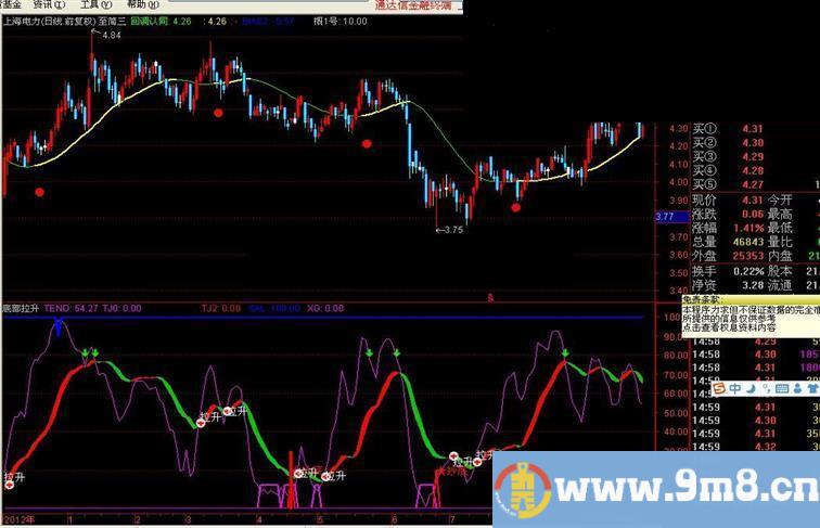 A4:=HHVBARS(HIGH,50) A5:=A1 AND A2>0.5 AND A3>0.3 AND A4; A6:=COUNT(A5,20)=1; TJ1:=A6 AND A5; STICKLINE(TJ1,0,20,4,0),COLOR009999; STICKLINE(TJ1,0,20,2,0),COLOR00BBBB; STICKLINE(TJ1,0,20,1,0),COLOR00DDDD; STICKLINE(TJ1,0,20,0.4,0),COLOR00FFFF; DRAWTEXT(TJ1 ,22,'抢弹'),COLOR00BBFF; VAR2W:=100-100*(HHV(HIGH,14)-CLOSE)/(HHV(HIGH,14)-LLV(LOW,14)); MW:= EMA(VAR2W,3); VAR3W:=EMA(VAR2W,7); M1:= EMA(VAR3W,5); MB1:=CROSS(MW,M1) AND M1<20; TJ2:IF((MB1),20,0),LINETHICK2,COLORRED; DRAWTEXT(CROSS(MW,M1) AND M1<20,22,'★抄底'),COLORRED; SAL: IF(TEND>=98,90,100),LINETHICK3,COLORFF0000; DRAWICON(CROSS(80,TEND),80,2); XG:TJ0 AND TJ2; STICKLINE(XG,0,30,4,0),COLOR000099; STICKLINE(XG,0,30,2,0),COLOR0000BB; STICKLINE(XG,0,30,1,0),COLOR0000DD; STICKLINE(XG,0,30,0.4,0),COLOR0000FF; TJ3:=CROSS(TEND,VAR12) AND VAR12<60; DRAWICON(TJ3,VAR12,23); DRAWTEXT(TJ3,TEND,'拉升'),COLORFFFFFF;