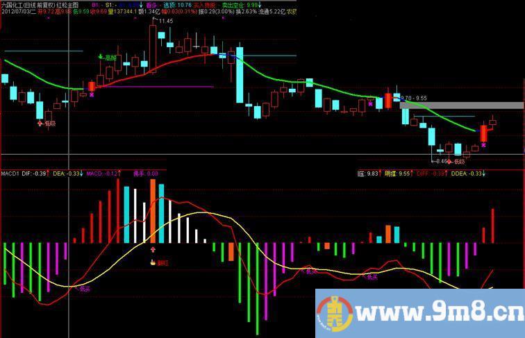 低买:CROSS(DIF,DEA) AND DIF<0,COLORFF00FF,NODRAW;