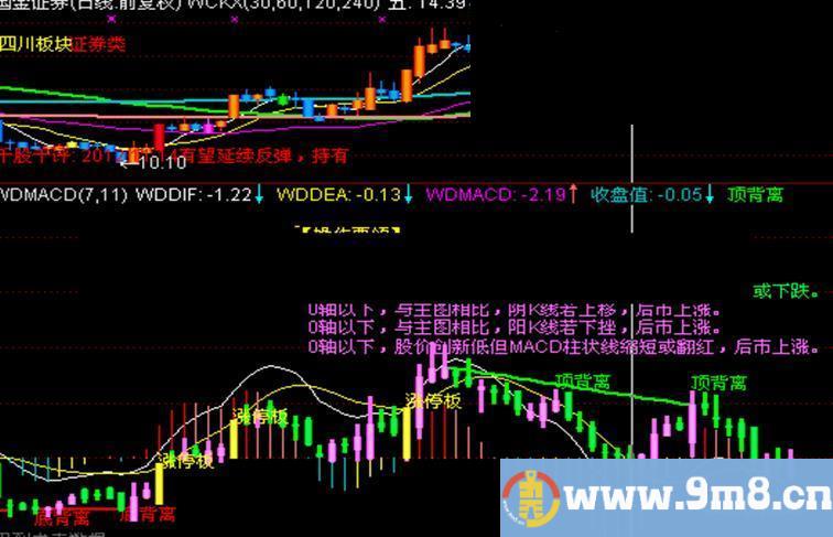 DRAWTEXT(CURRBARSCOUNT=40,WZ*0.80,'0轴以下,与主图相比,阴K线若上移,后市上涨。'),COLORFF66FF;