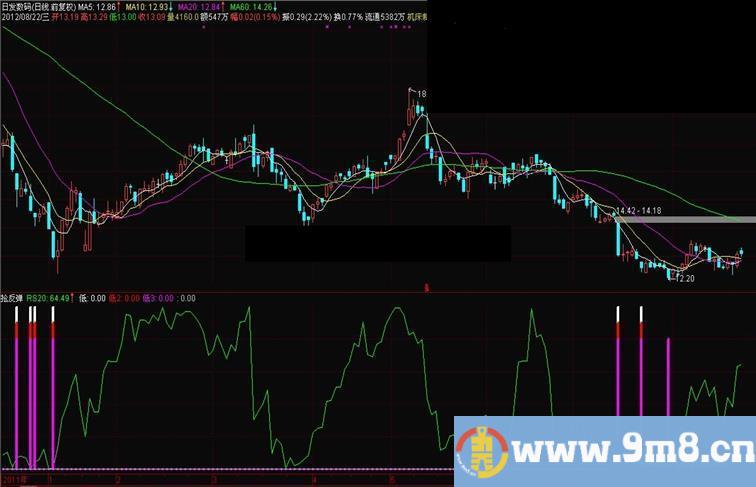 BI40:=(C-MA(C,40))/MA(C,40)*100+14,COLORFF00FF;