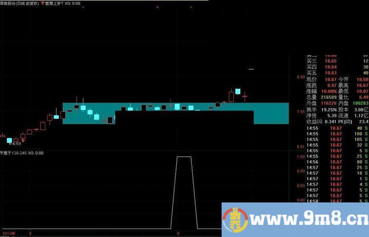 说明:股价在120日线和240日线之间横盘整理3周以上,突然突破前高线,将有20%以上的收益;