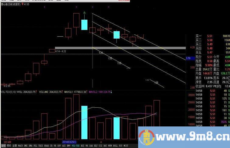 上穿一条平行线为买进,下一条平行线有支撑,高位注意风险,