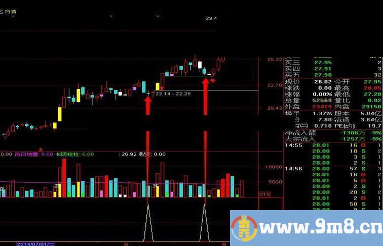 该公式为左边放量上涨然后回踩时出现买点接入
