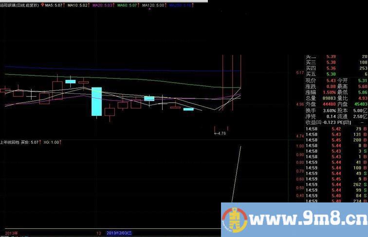 说明:昨日涨停上穿年线,今天下跌回档到60日均线附近;