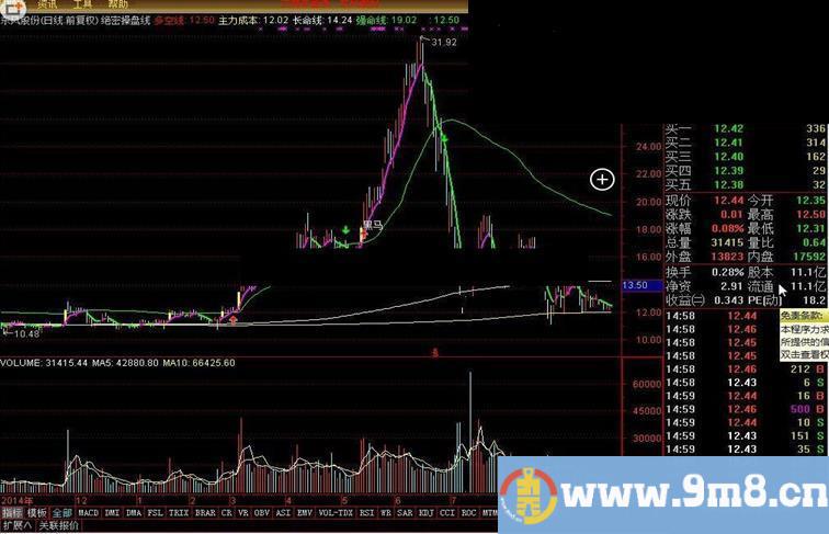 2、当股价上穿主力成本线后,多空线上穿强命线,可择机买入。}