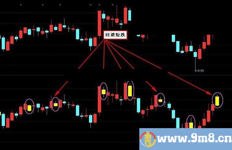 DRAWKLINE(H,O,L,C); A:=IF(C>REF(C,1),V,-V); B:=SQRT(HHV(IF(C>REF(C,1),V,-V),1)*LLV(IF(C>REF(C,1),V,-V),1)); XG:BA AND CREF(C,2)*1.01,NODRAW; STICKLINE(FILTER(XG,5),O,C,3,0),COLORYELLOW; STICKLINE(FILTER(XG,5),L,H,0,1),COLORYELLOW;