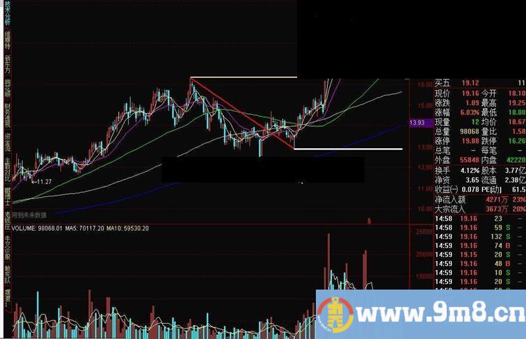 TJ1:=COUNT(V BL:=TJ1/(TT+1)*100; XG:=TJ AND TT>40 AND BL>70; XGT:=BARSLAST(CURRBARSCOUNT=CONST(BARSLAST(XG))+1); ZH:=REF(H,TT); YL:=REF(L,LTT); XC:=REF(C,XGT); YZ:=(XC-YL)/YL*100; ZBL:=YZ/REF(LTT,XGT); XGA:=XG AND ZBL<2.95; BB:DRAWLINE(TT=0,H,LTT=0,L,0),COLORRED,LINETHICK2; 锅底:DRAWLINE(CURRBARSCOUNT>CONST(LT1)+0,L,ISLASTBAR,REF(L,LT1),0),COLORWHITE,LINETHICK3; B:=DRAWLINE(CURRBARSCOUNT>DLOW,L,ISLASTBAR,REF(H,DLOW),0),COLORRED,LINETHICK2; DRAWLINE(LTT=0,L,XGT=0,L,0),COLORRED; DRAWICON(XGA,L*0.95,9); XG1:=TJ AND TT>40 AND BL>20;