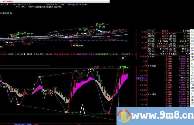 N:=9; DRAWBAND(K,RGB(220,0,220),D,RGB(180,140,140)); 底:= 5,COLORCYAN, COLOR77AA1A; VAR1:=3; OBV:=J; {顶部明确} {宝塔顶底} 清仓卖出:= 3.5; {上证顶部}