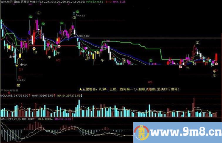 做多:=IF(K>D AND MACD>0 AND V>1,2,0),COLORRED;