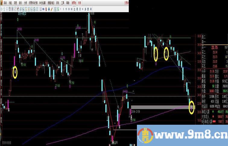 压:DRAWLINE(HIGH>=HHV(HIGH,10),HIGH,LOW<=LLV(LOW,3),HHV(HIGH,3),1),COLORFFFF00,LINETHICK1,DOTLINE;